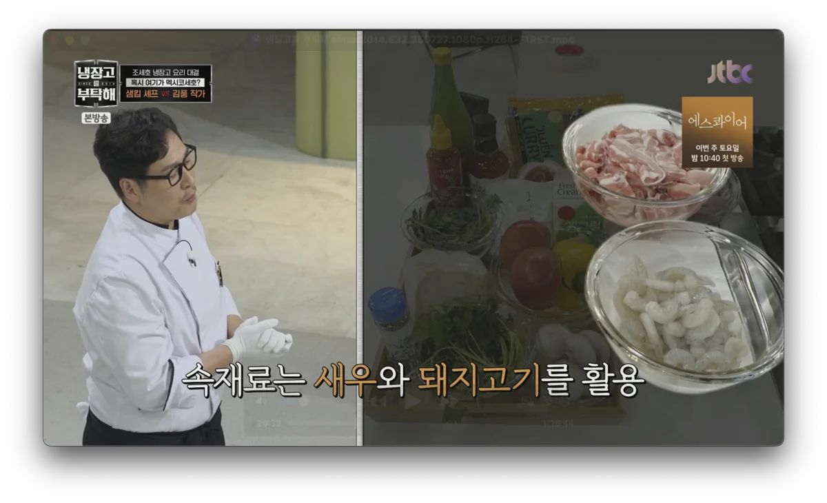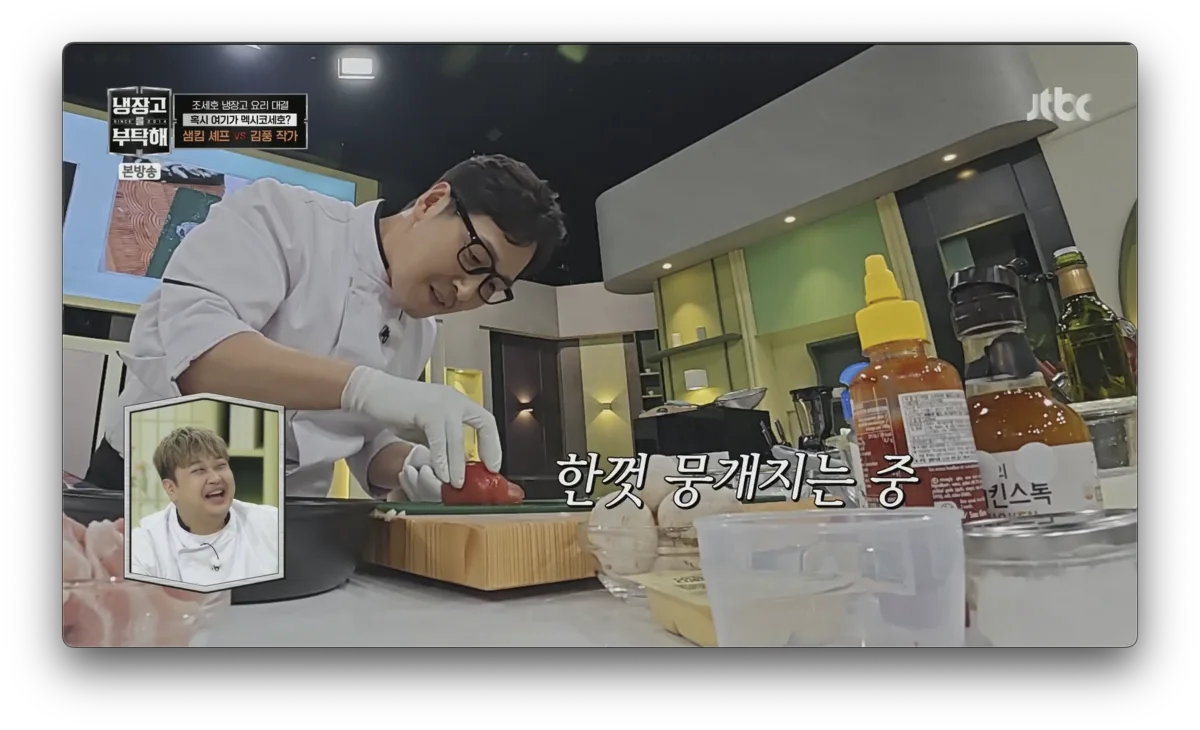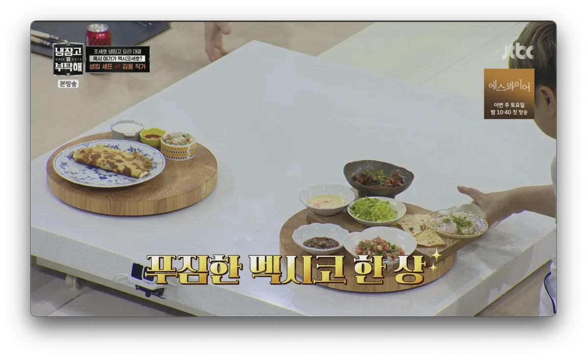JTBC 예능 냉장고를부탁해2 7월 27일 방송에서는 조세호의 냉장고 속 재료로 샘킴 셰프와 김풍 작가가 멕시코 감성 요리 대결을 펼쳤습니다. “칸쿤 해변을 느끼게 해달라”는 조세호의 요청에 샘