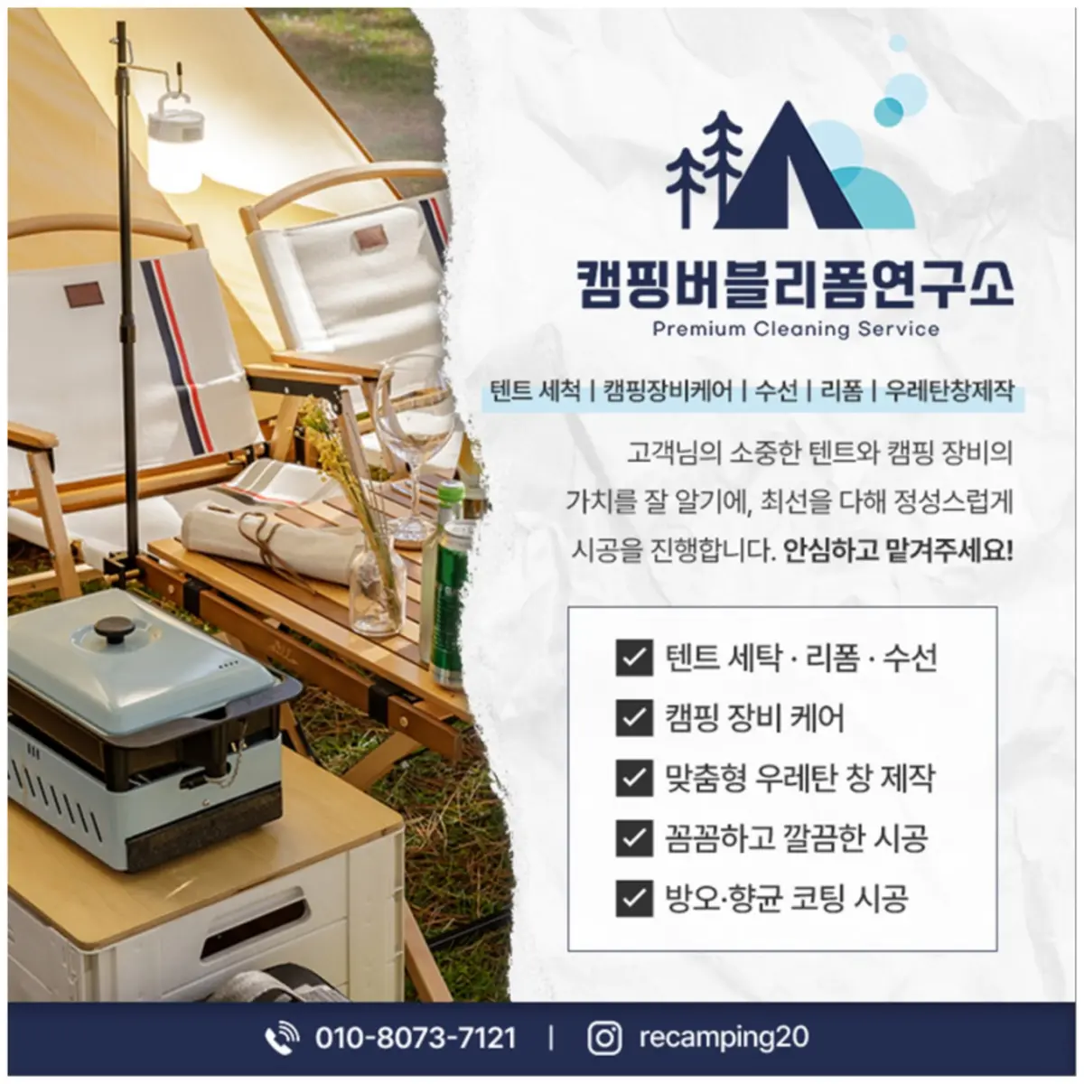 단순히 때를 빼는 수준이 아니라, 곰팡이 제거, 주름 개선, 항균/방오 코팅, 발수 처리까지 이뤄져 캠핑 장비의 수명을 늘리고 쾌적함을 회복하는 데 목적을 두고 있습니다.