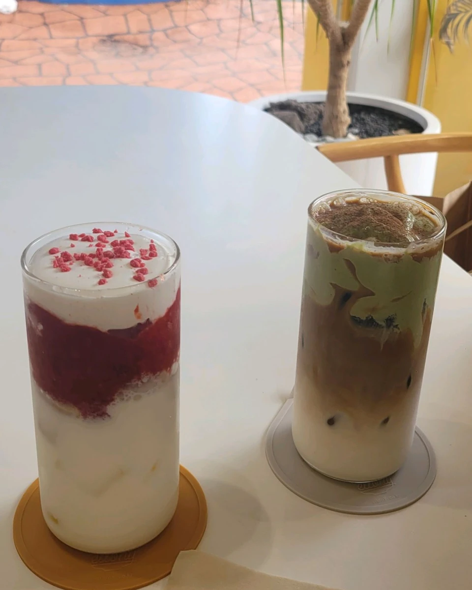 방송에서도 소개된 대표 메뉴는 생딸기청을 직접 만든 딸기라떼와 진한 맛의 말차라떼, 그리고 크림의 조화가 인상적인 아인슈패너 라떼입니다.