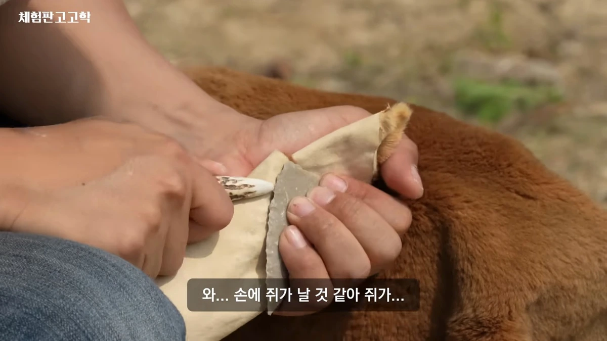 • 원시 방식으로 돌을 깨고, 뼈를 가공하는 고고학적 방법 시연