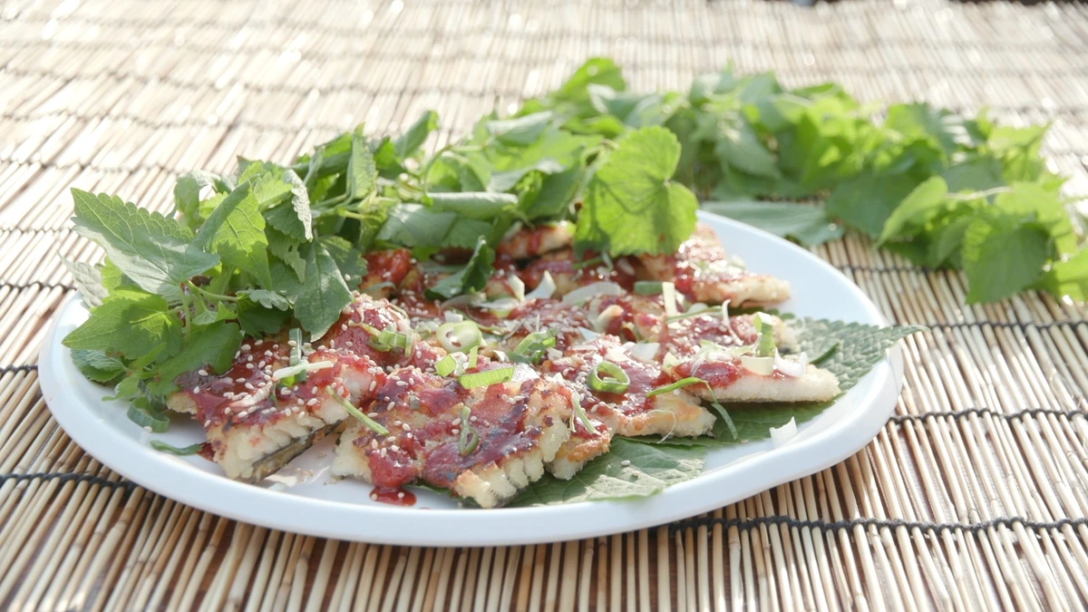 넷째는 갯장어 구이, 바삭하게 구운 장어에 특제 양념장을 발라낸 별미로, 방앗잎 고명이 올라가 향과 맛을 모두 만족시킵니다.