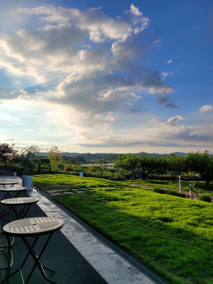 - 과수원 뷰 감상: 실내 통창과 야외 루프탑에서 복숭아밭이 보이는 사계절 감성 뷰